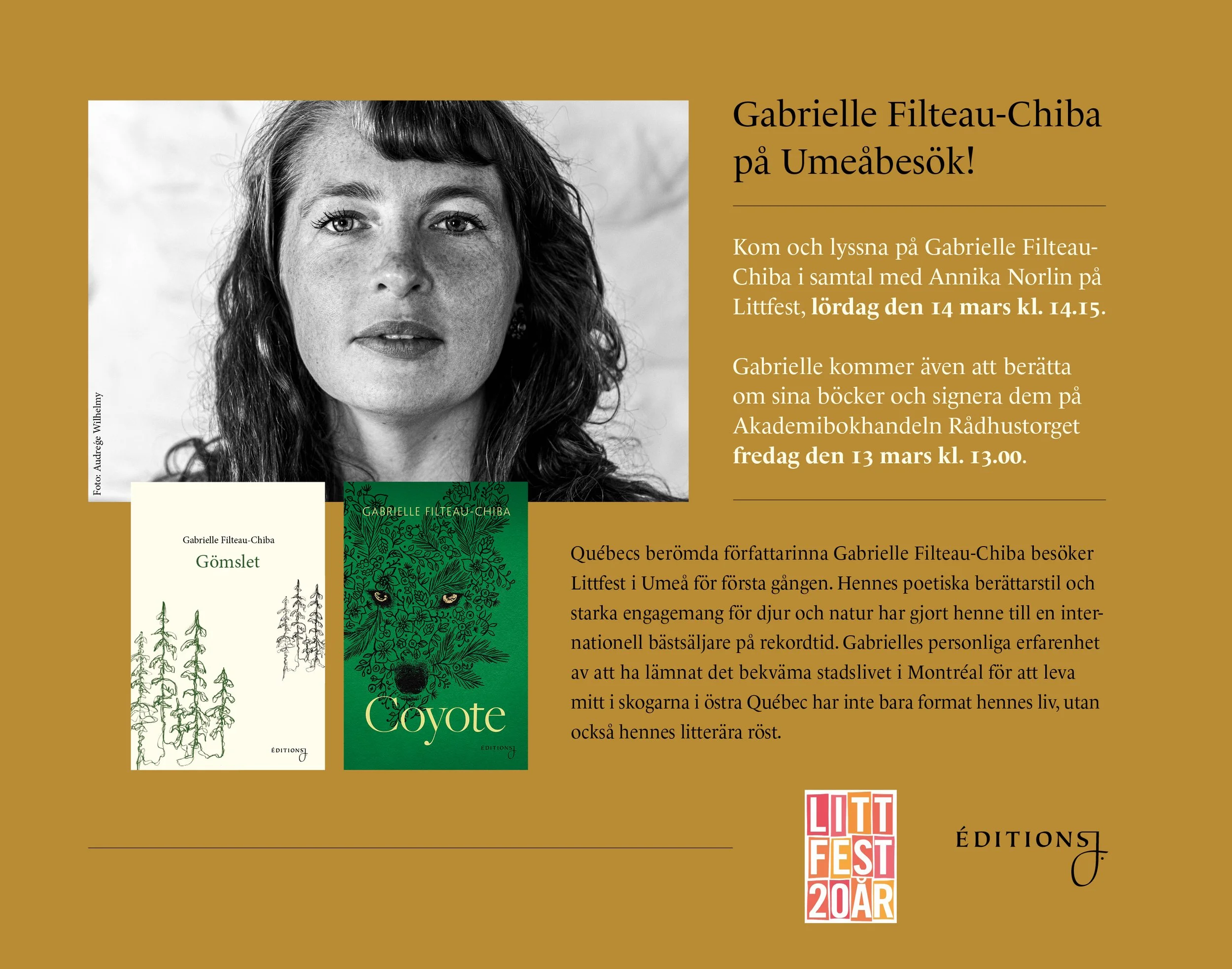 Gabrielle Filteau-Chiba på Littfest i Umeå! 2 feb. Skrivet av Johanna Kinch Québec författarinna Gabrielle Filteau-Chiba i samtal med Annika Norlin på Umeås Littfest. Johanna Kinch